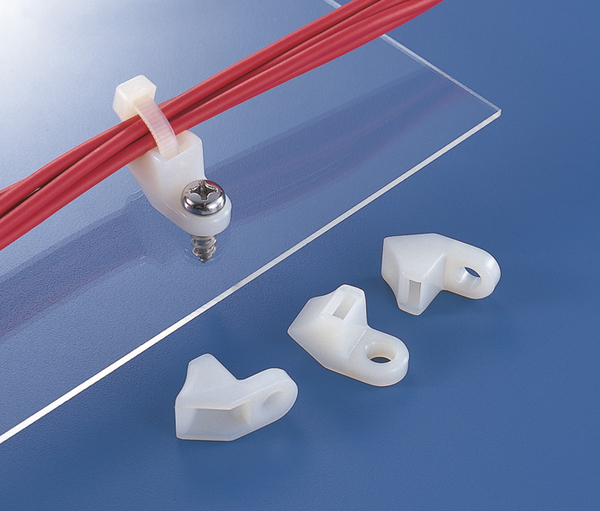 | Zastosowanie | W obszarach o ograniczonej przestrzeni elementy tego typu pozwalają na odsunięcie przewodu od otworu mocującego i umożliwiają montaż przed instalacją przewodów. Podstawową zaletą jest możliwość łączenia elementu mocującego z różnymi opaskami kablowymi, co zapewnia oszczędność kosztów i wygodę stosowania bez konieczności magazynowania szerokiej gamy opasek. |