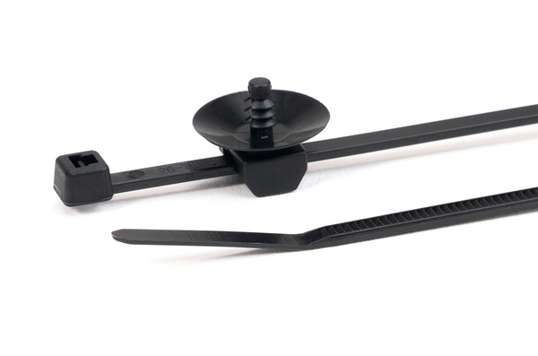 | Krótki opis | Opaska dwuczęściowa 100x2,5 mm, z mocowaniem choinkowym, z talerzykiem, do otworów okrągłych, PA66HSUV/PA66HSW, kolor czarny |